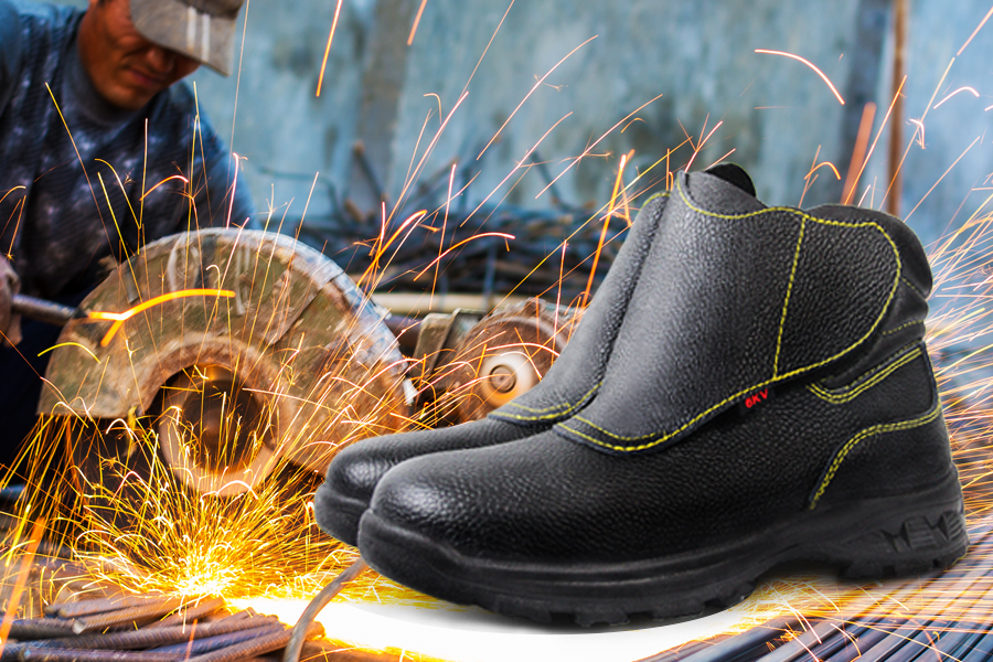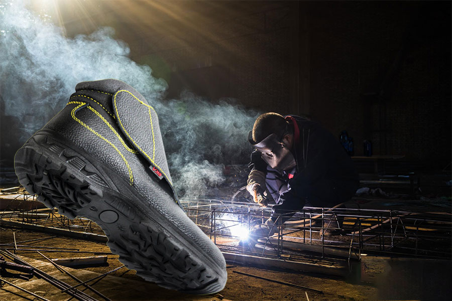 作业时进行焊接工作,焊机作用于板材上,会有喷溅的火花或者其他高温物质飞溅出,电焊工若穿着耐高温安全鞋可以有效防护足部,保证作业安全。
